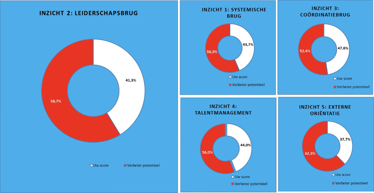 In de rapportage (die uiteraard gebaseerd is op de scores van de 4 invullers uit jouw organisatie) van deze leiderschap stresstest zijn altijd 2 overzichten opgenomen om het verbeterpotentieel inzichtelijk te krijgen.